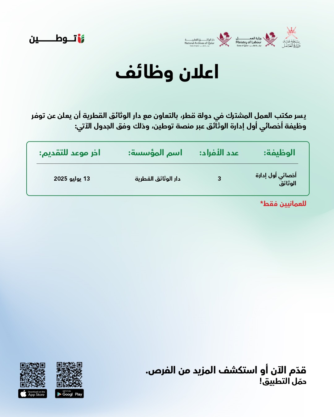 منصة توطين - مكتب العمل المشترك في دولة قطر بالتعاون مع دار الوثائق القطرية أن يعلن عن توفر وظيفة أخصائي أول إدارة