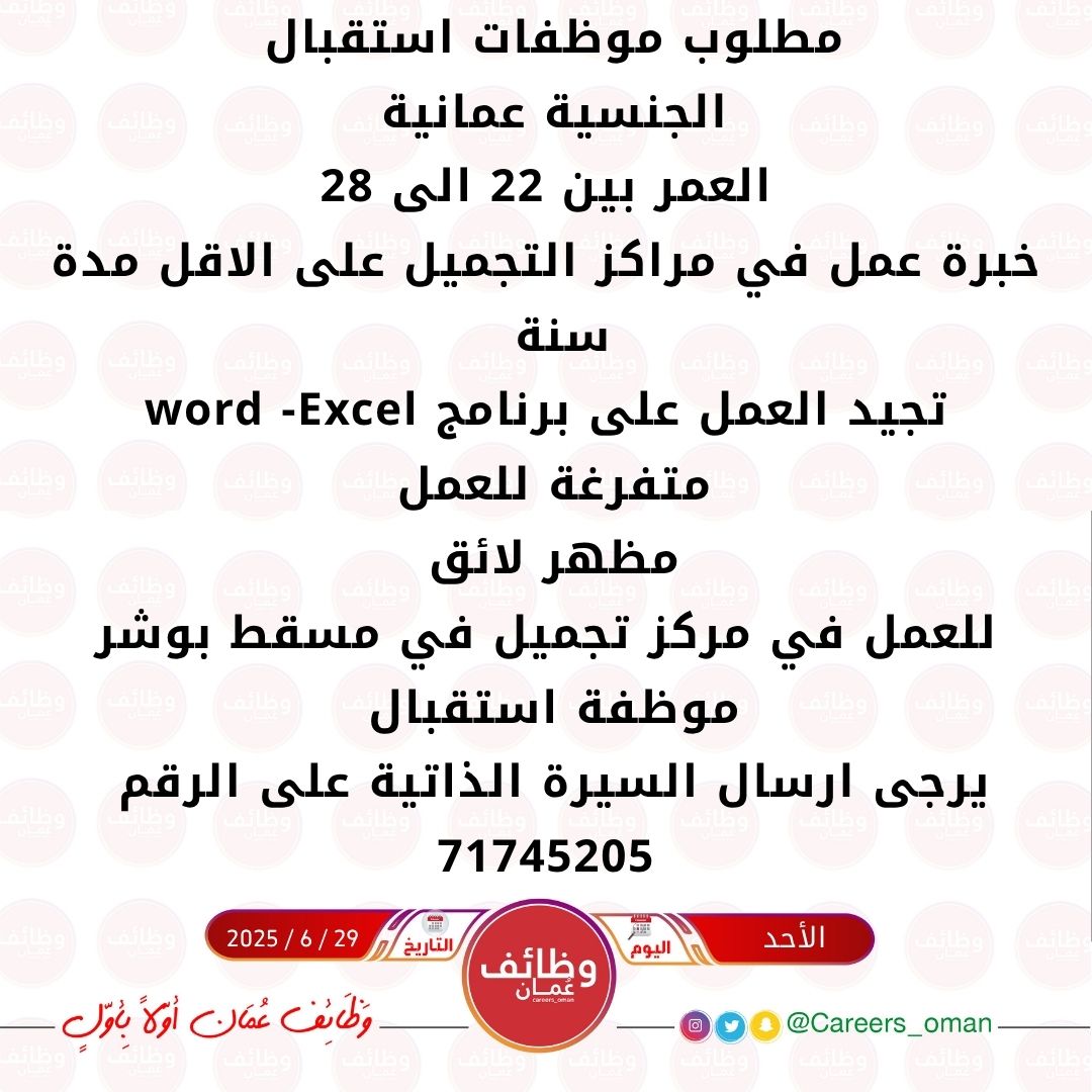 مركز تجميل في بوشر - وظيفة شاغرة ( موظفة استقبال )