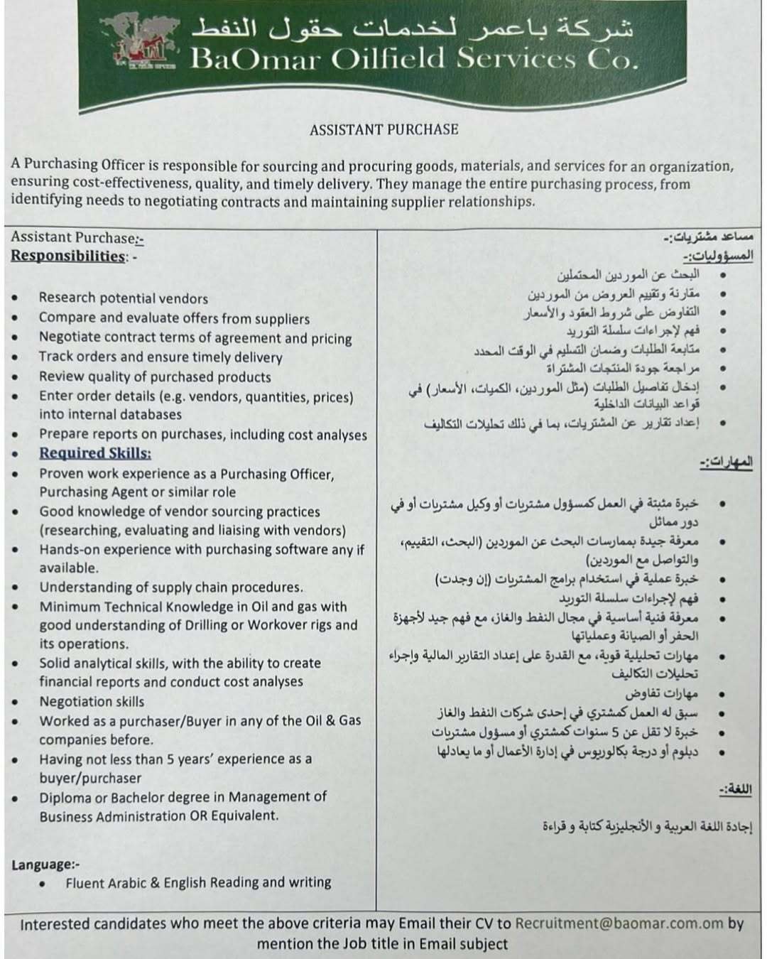 شركة باعمر لخدمات حقول النفط - وظيفة شاغرة ( مساعد مشتريات )