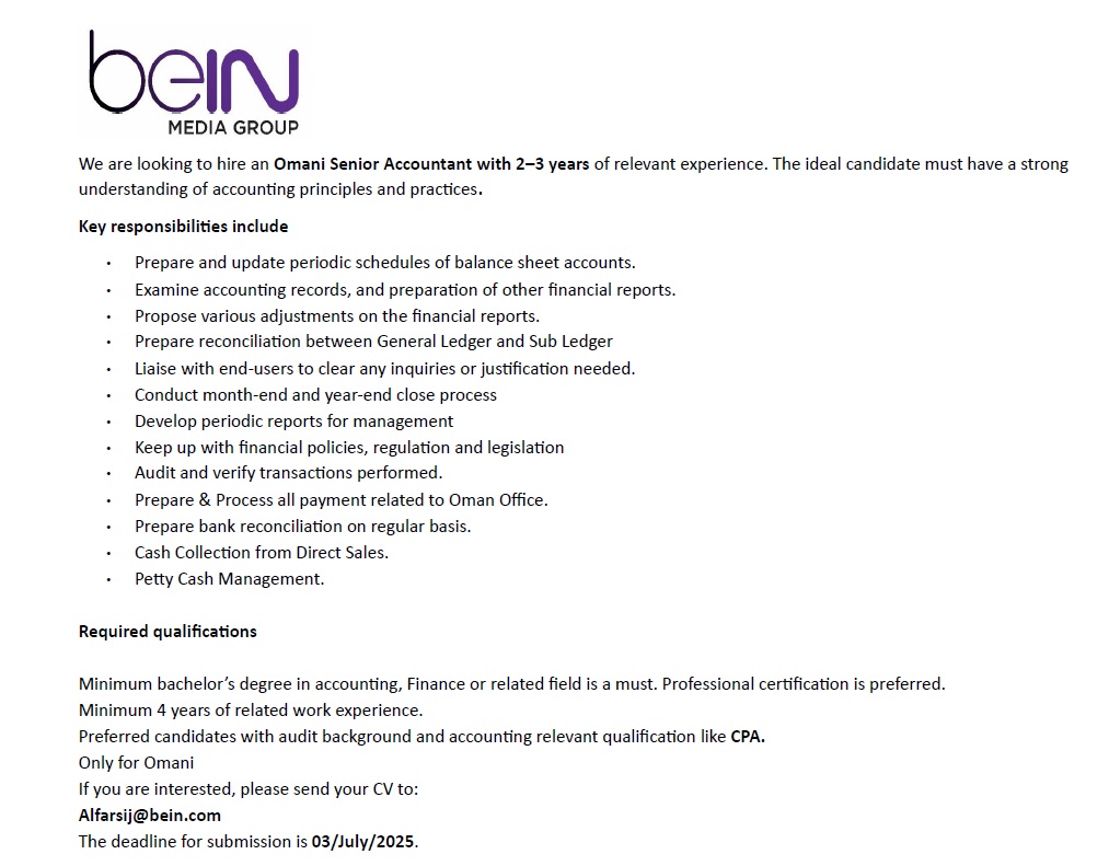 شركة بي ان سبورتس فرع عمان - وظيفة شاغرة ( Senior Accountant )