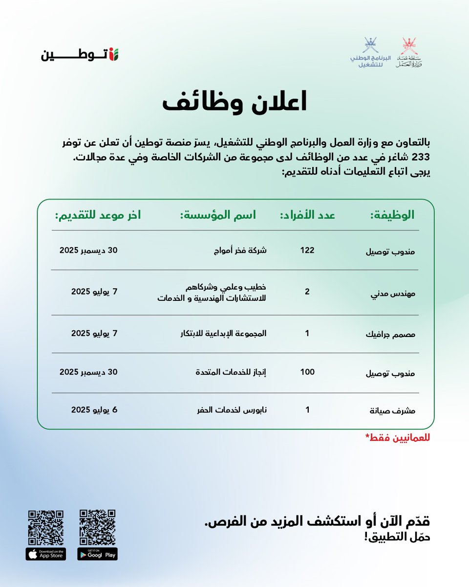 منصة توطين - 233 وظيفة شاغرة لدى مجموعة من الشركات الخاصة وفي عدة مجالات