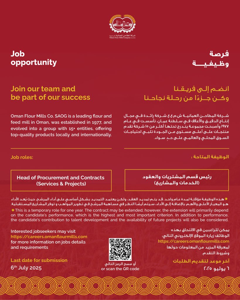 شركة المطاحن العمانية - وظيفة شاغرة ( رئيس قسم المشتريات والعقود )