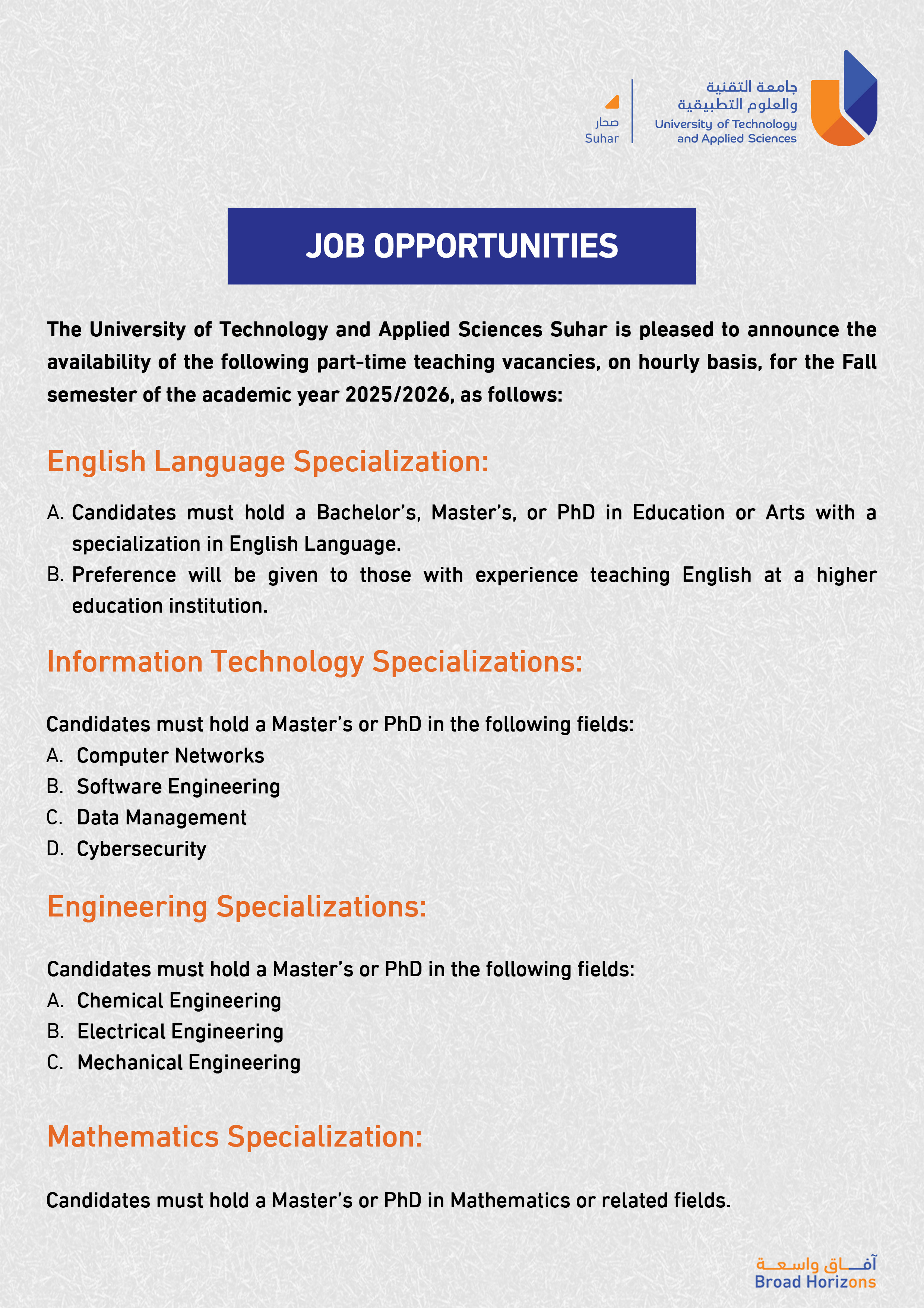 جامعة التقنية والعلوم التطبيقية في صحار - شواغر تدريسية بنظام العمل الجزئي / الاجر بالساعات في مختلف التخصصات