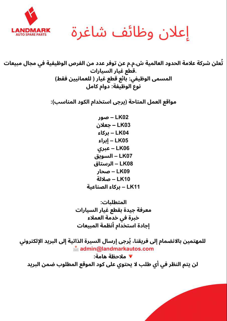 شركة علامة الحدود العالمية - فرص وظيفية شاغرة ( بائع قطع غير )