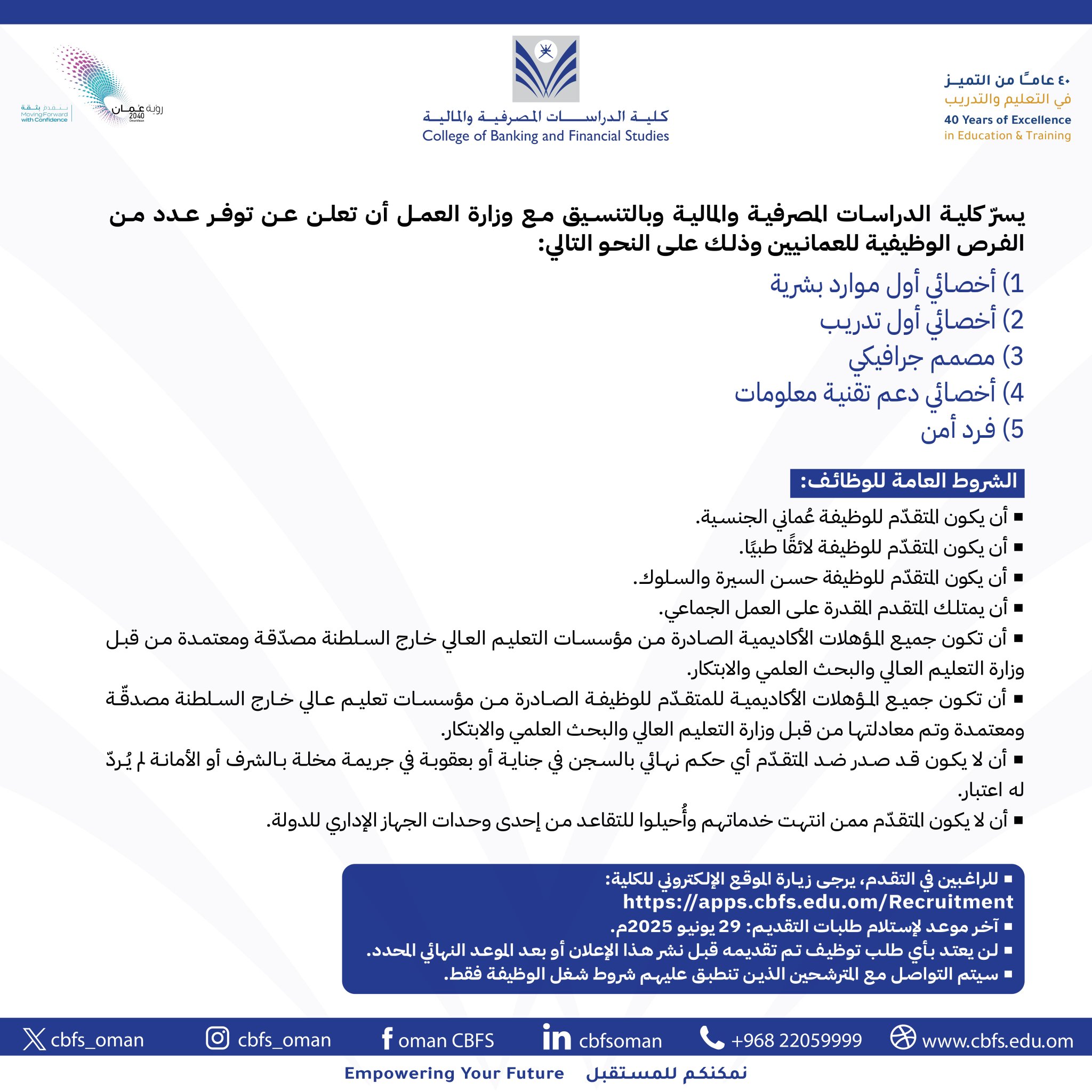 كلية الدراسات المصرفية والمالية - 5 وظائف شاغرة