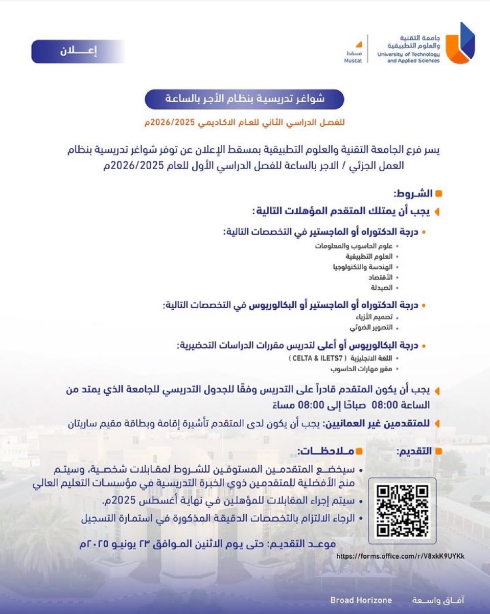 جامعة التقنية والعلوم التطبيقية بمسقط - شواغر تدريسية بنظام العمل الجزئي / الاجر بالساعات