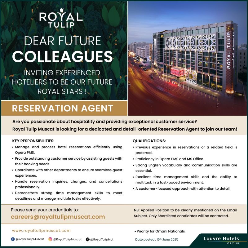 فندق رويال توليب مسقط - وظيفة شاغرة ( RESERVATION AGENT )