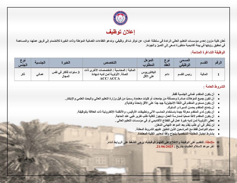 كلية مزون - وظيفة شاغرة ( رئيس قسم المالية )
