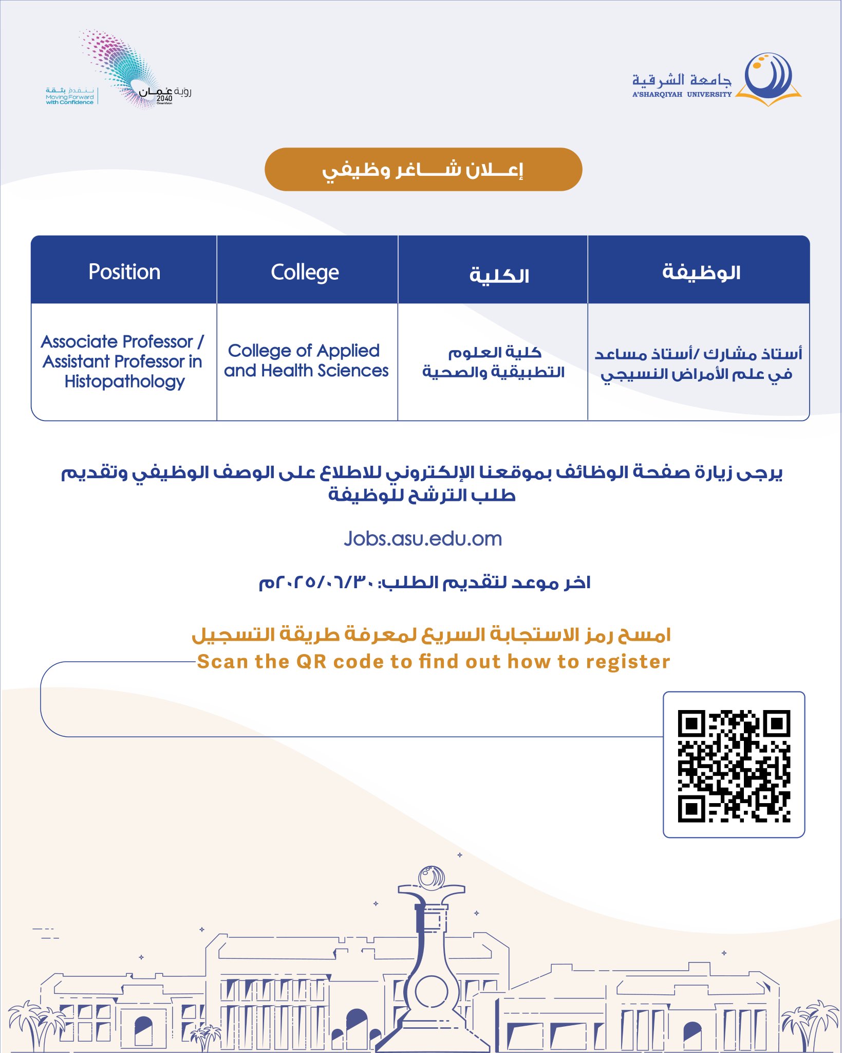 جامعة الشرقية - وظيفة شاغرة ( أستاذ مشارك /أستاذ مساعد في علم الأمراض النسيجي )