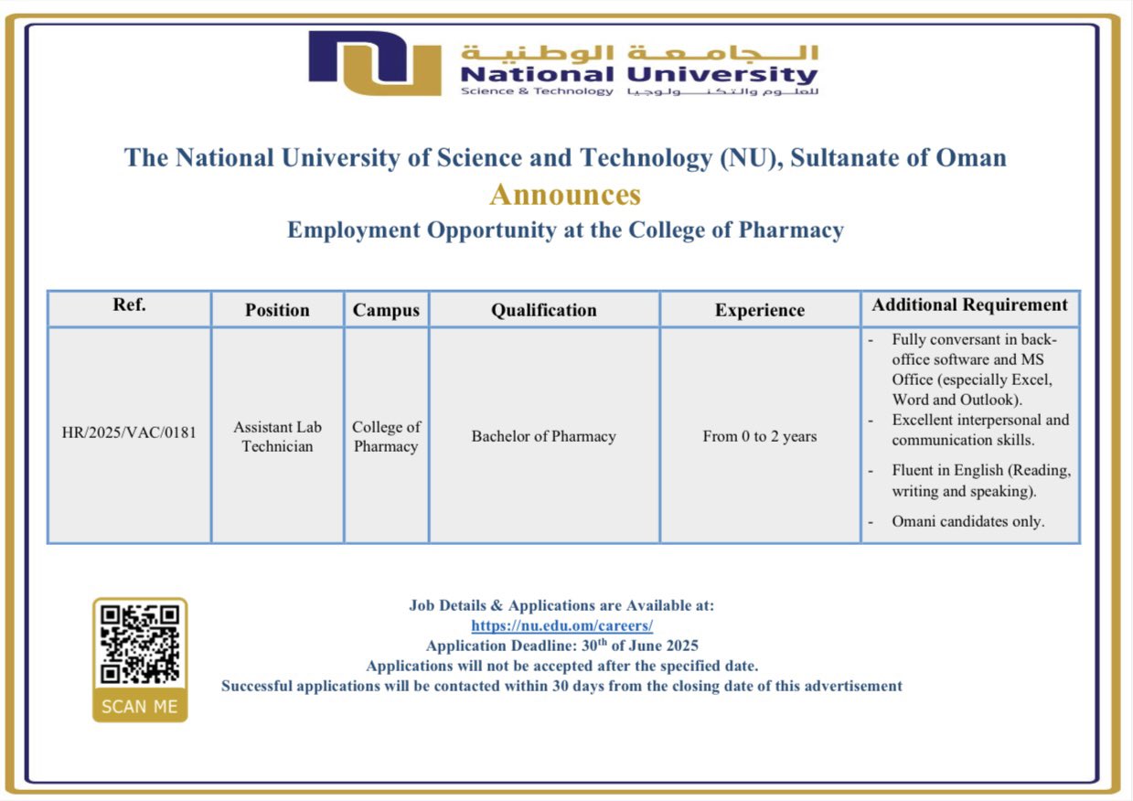 الجامعة الوطنية للعلوم والتكنولوجيا - وظيفة شاغرة