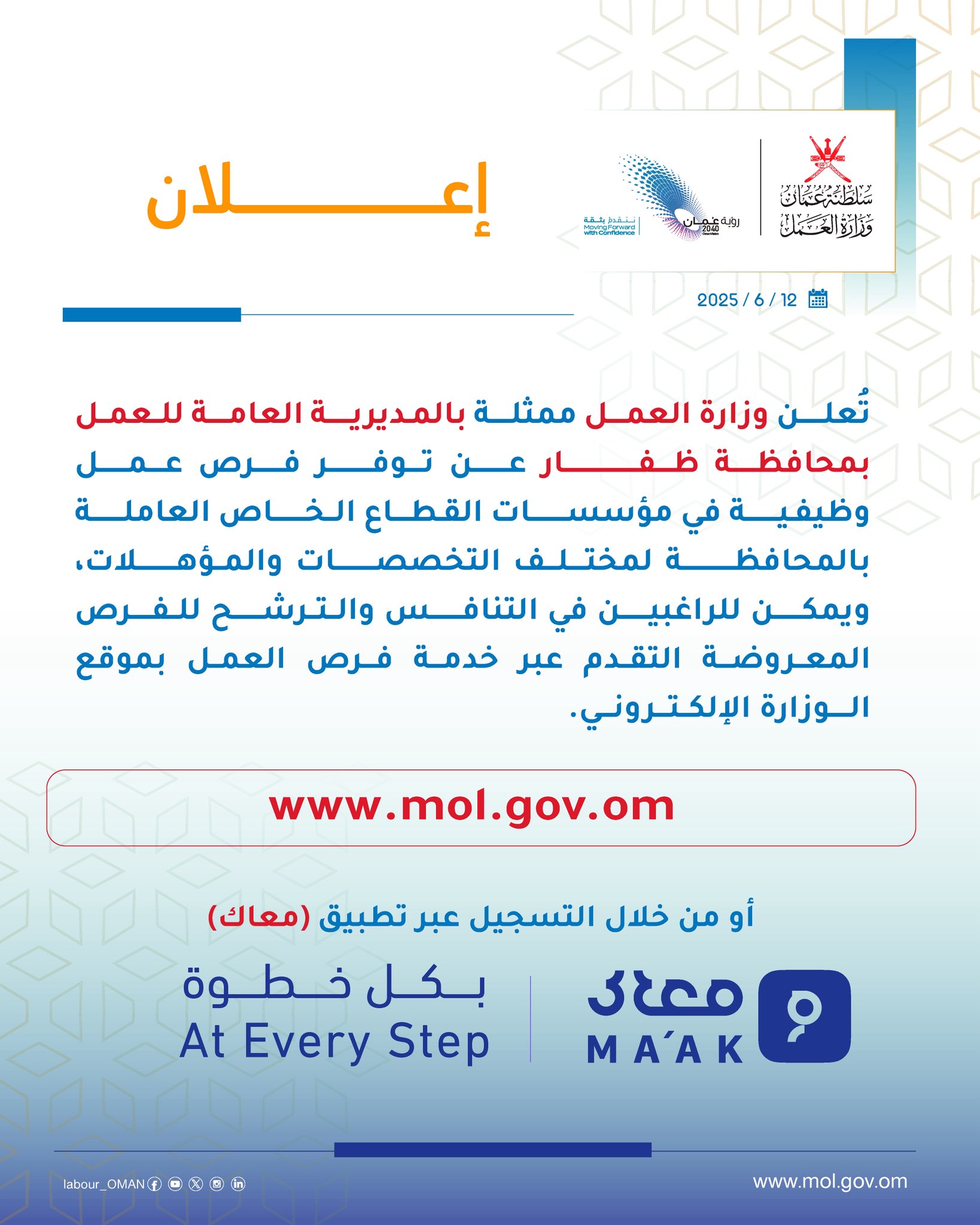 وزارة العمل ممثلة بالمديرية العامة للعمل بمحافظة ظفار - توفر عدد من فرص العمل الوظيفية في مؤسسات القطاع الخاص