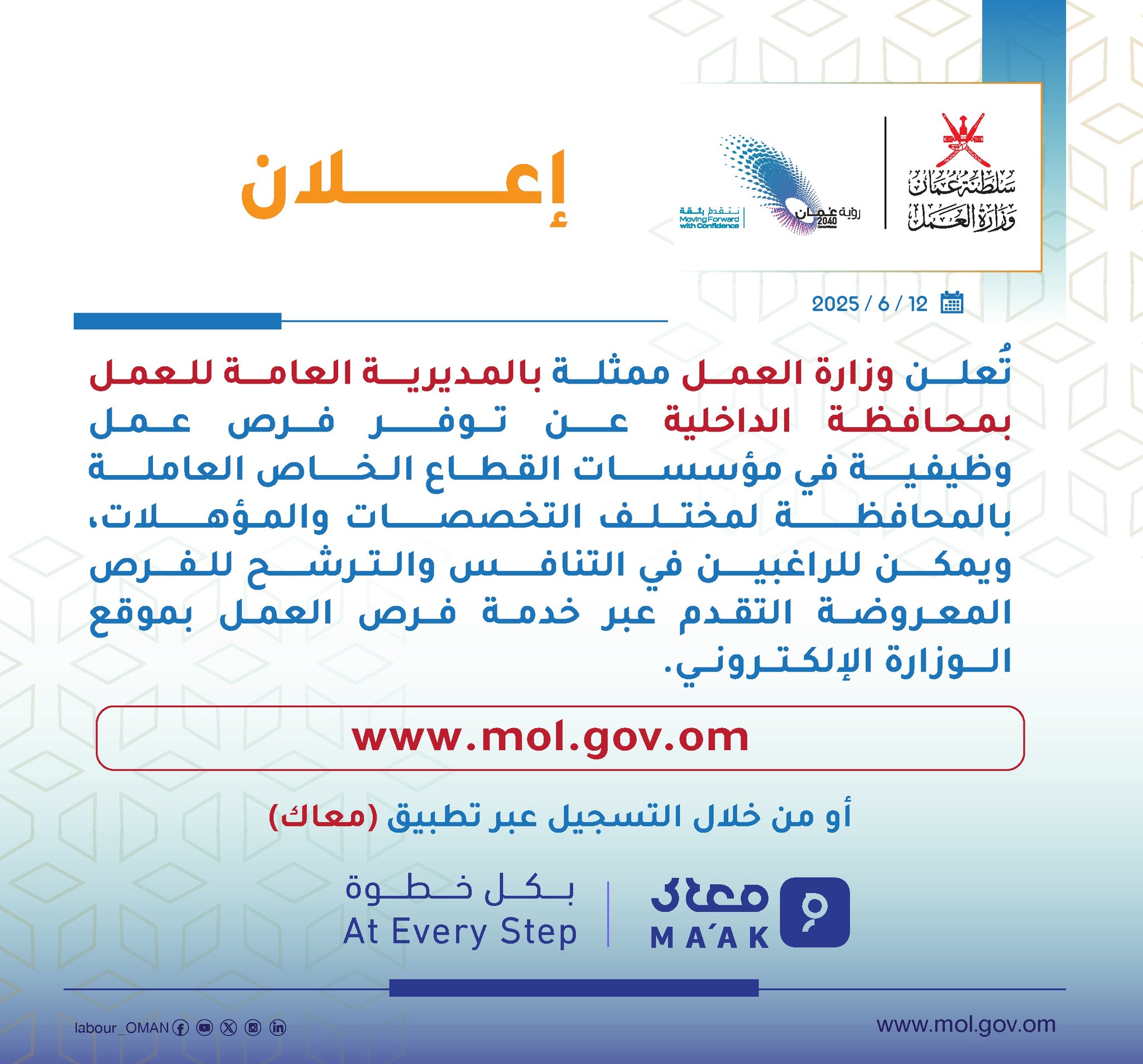 وزارة العمل ممثلة بالمديرية العامة للعمل بمحافظة الداخلية - توفر فرص عمل وظيفية في مؤسسات القطاع الخاص