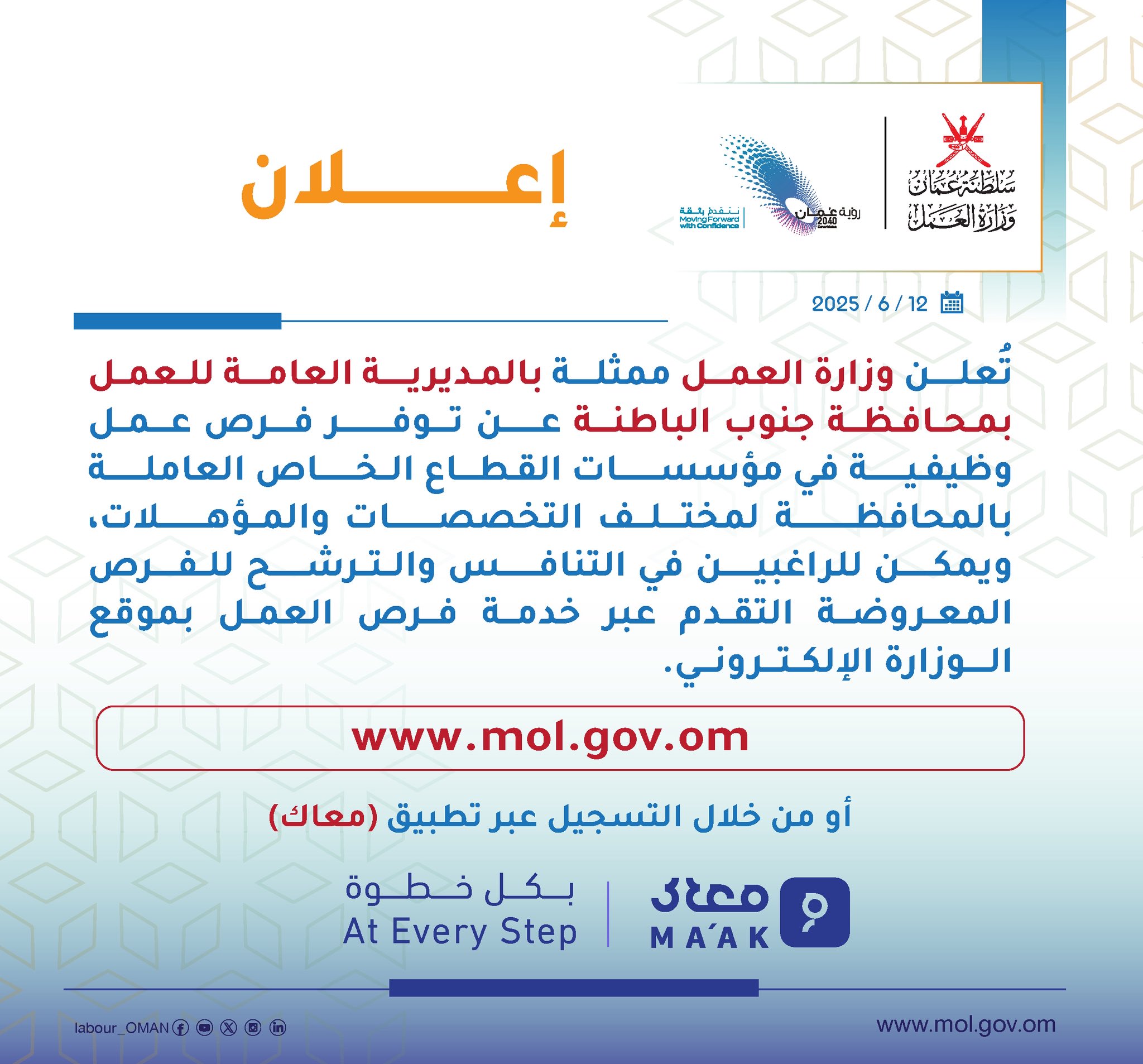 وزارة العمل ممثلة بالمديرية العامة للعمل بمحافظة جنوب الباطنة - توفر فرص عمل وظيفية في مؤسسات القطاع الخاص