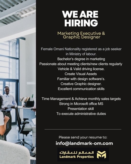 شركة المعالم للعقارات - وظيفة شاغرة ( Marketing Executive & Graphic Designer )