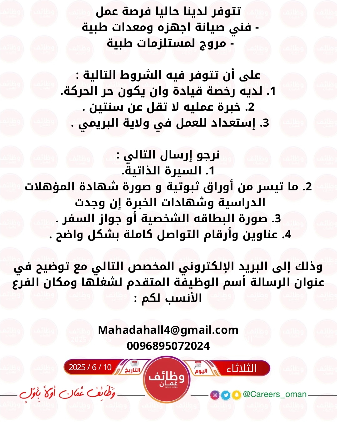 شركة بيع المستلزمات الطبية وصيانتها في البريمي - فرص وظيفية ( فني صيانه اجهزه ومعدات طبية + مروج لمستلزمات طبية )