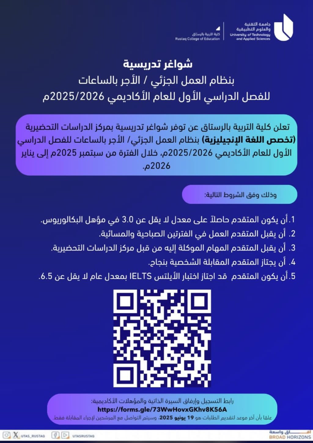 كلية التربية بالرستاق - شواغر تدريسية بنظام العمل الجزئي / الأجر بالساعات