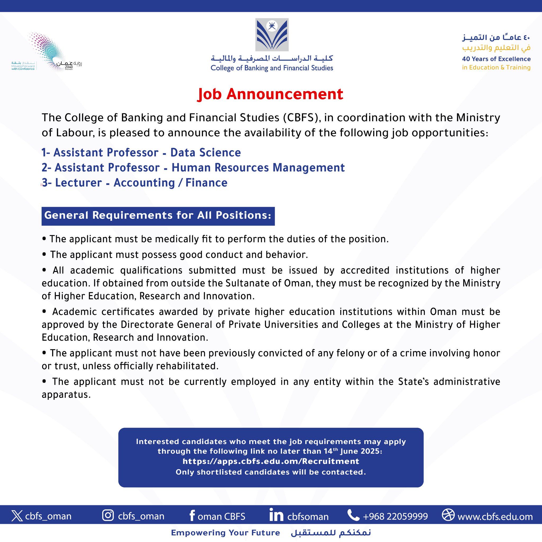 كلية الدراسات المصرفية والمالية - وظائف شاغرة