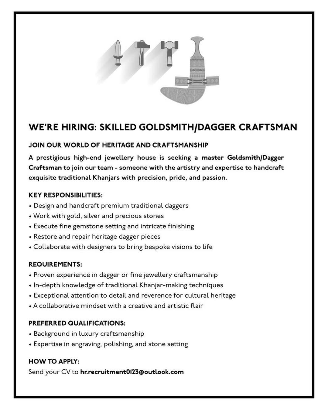 مؤسسة مجوهرات في مسقط - وظيفة شاغرة ( SKILLED GOLDSMITH/DAGGER CRAFTSMAN )