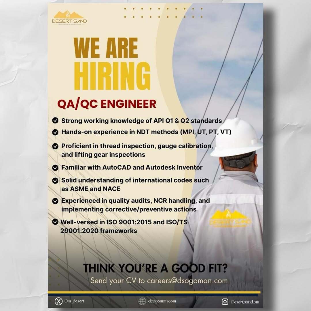 شركة رمال الصحراء للنفط والغاز - وظيفة شاغرة ( QA/QC ENGINEER )