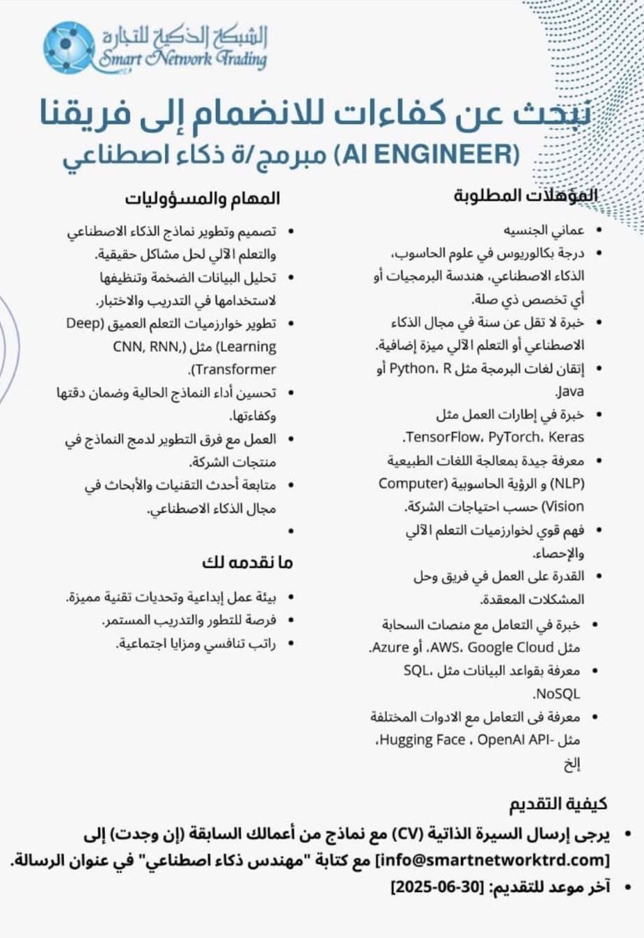 الشبكة الذكية للتجارة - وظيفة شاغرة ( مبرمج/ة ذكاء اصطناعي )