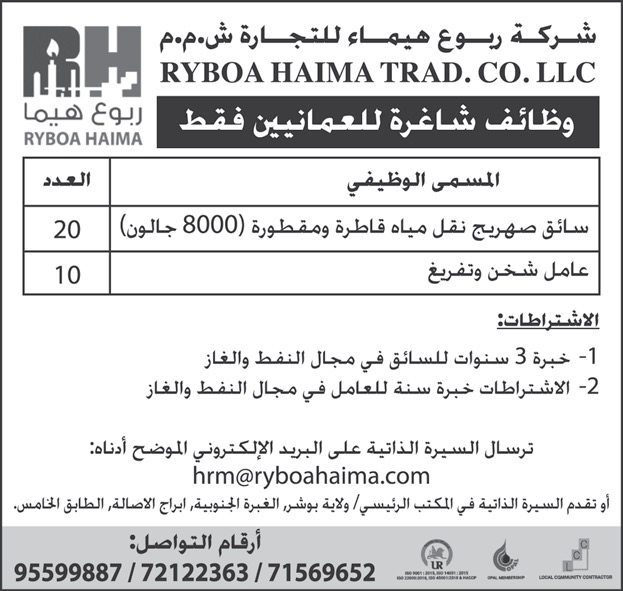 شركة ربوع هيماء للتجارة - 30 فرصة وظيفية ( سائق صهريج نقل مياه + عامل شحن وتفريغ )