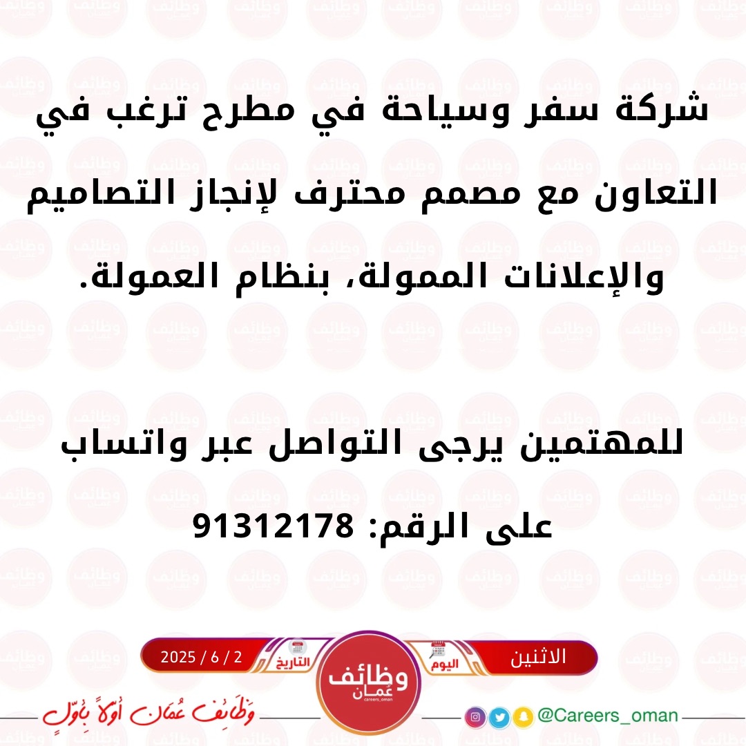 شركة سفر وسياحة في مطرح - وظيفة شاغرة بنظام العمولة ( مصمم )