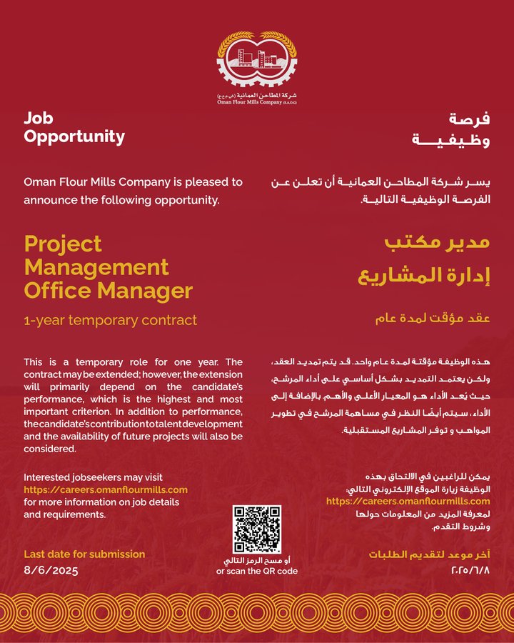 شركة المطاحن العمانية - وظيفة شاغرة ( مدير مكتب إدارة المشاريع )