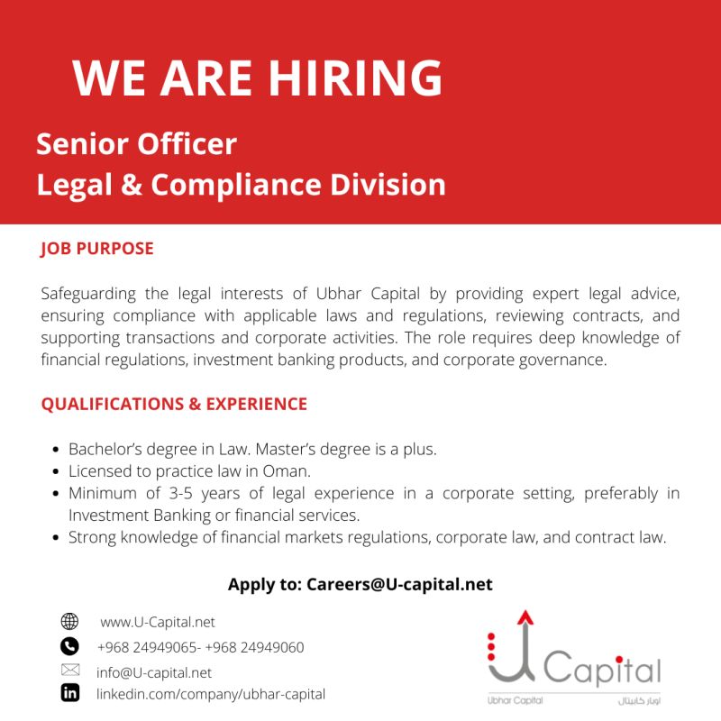 شركة اوبار كابيتال - وظيفة شاغرة ( Senior Officer Legal & Compliance Division )