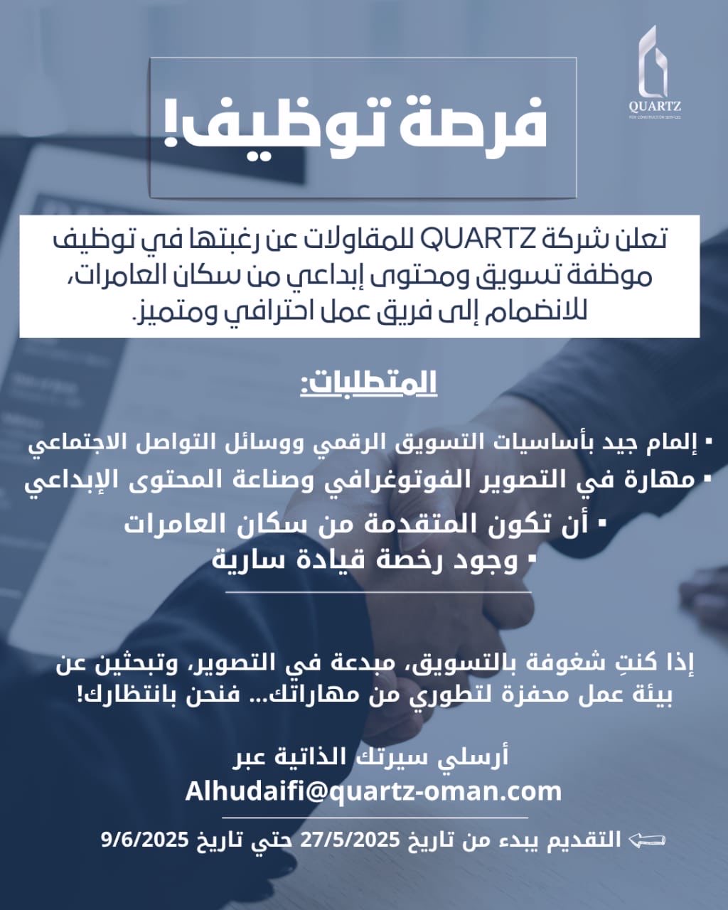 شركة QUARTZ للمقاولات في العامرات - وظيفة شاغرة ( موظفة تسويق ومحتوى إبداعي )