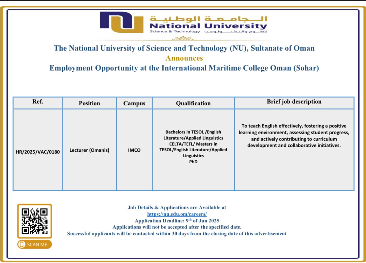 الجامعة الوطنية للعلوم والتكنولوجيا - وظيفة شاغرة ( Lecturer )