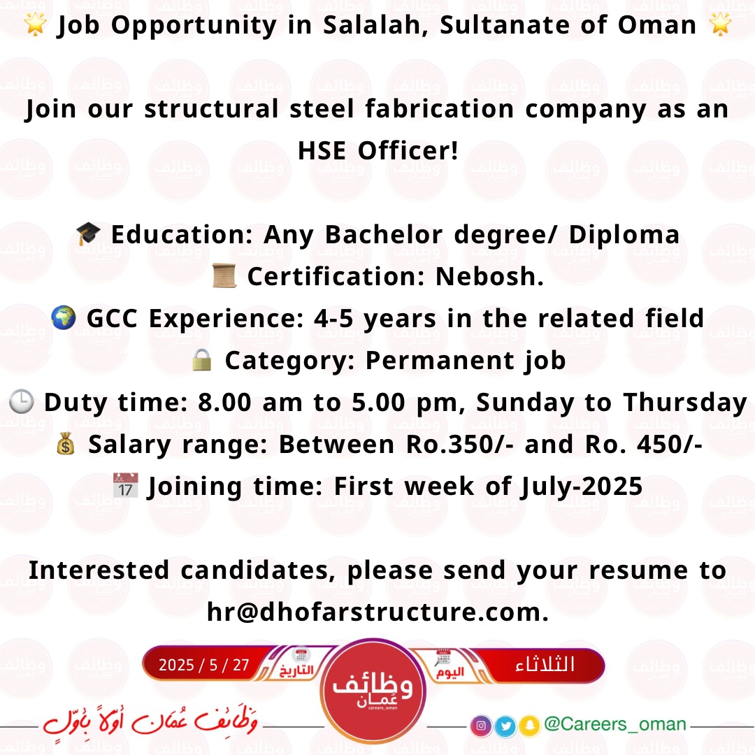 شركة DHOFAR STRUCTURES AND IRON INDUSTRIES في ظفار - وظيفة شاغرة ( HSE Officer )