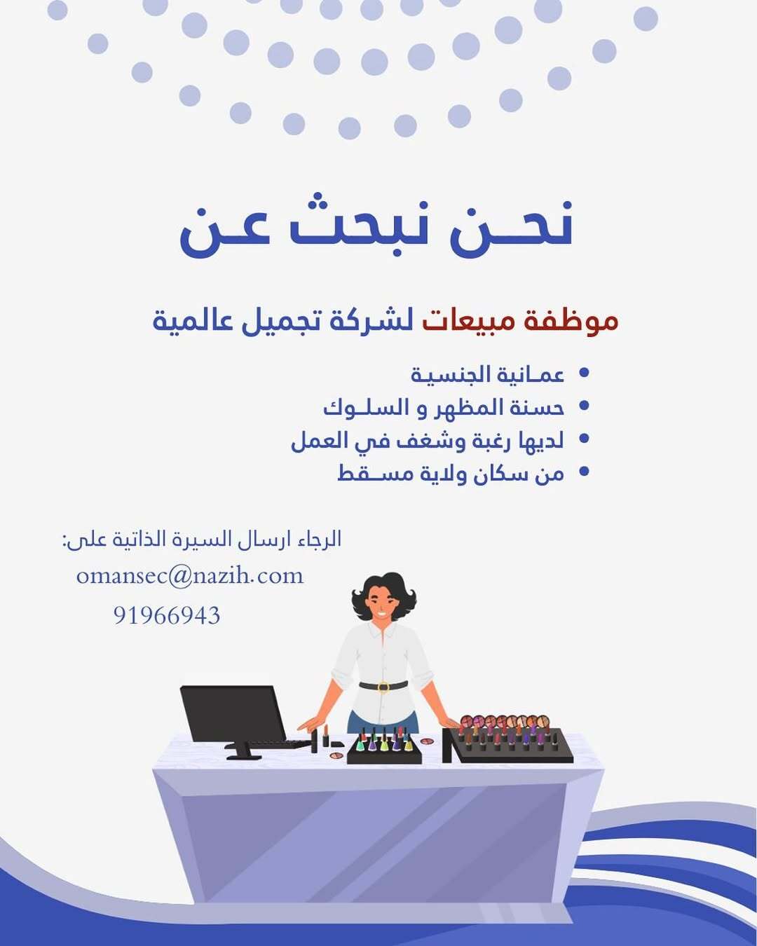 شركة تجميل عالمية في مسقط - وظيفة شاغرة ( موظفة مبيعات )