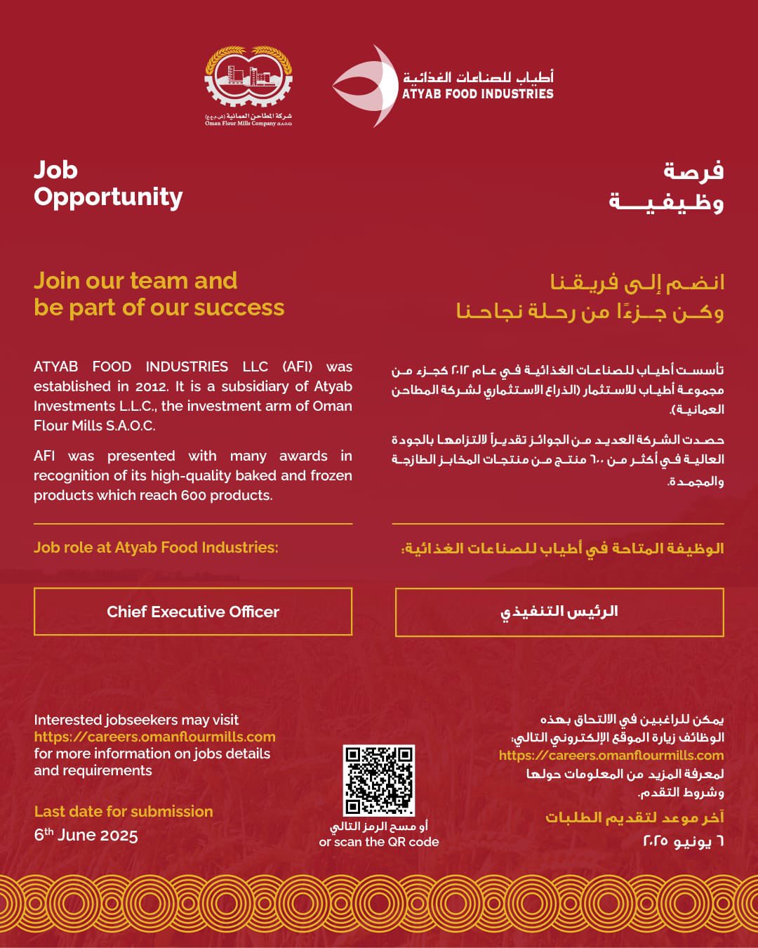 شركة المطاحن العمانية - توفر شاغر وظيفي ( الرئيس التنفيذي )