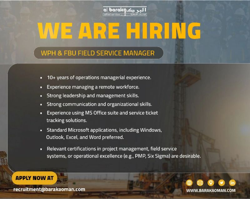 شركة البركة للخدمات النفطية - وظيفة شاغرة ( WPH & FBU FIELD SERVICE MANAGER )
