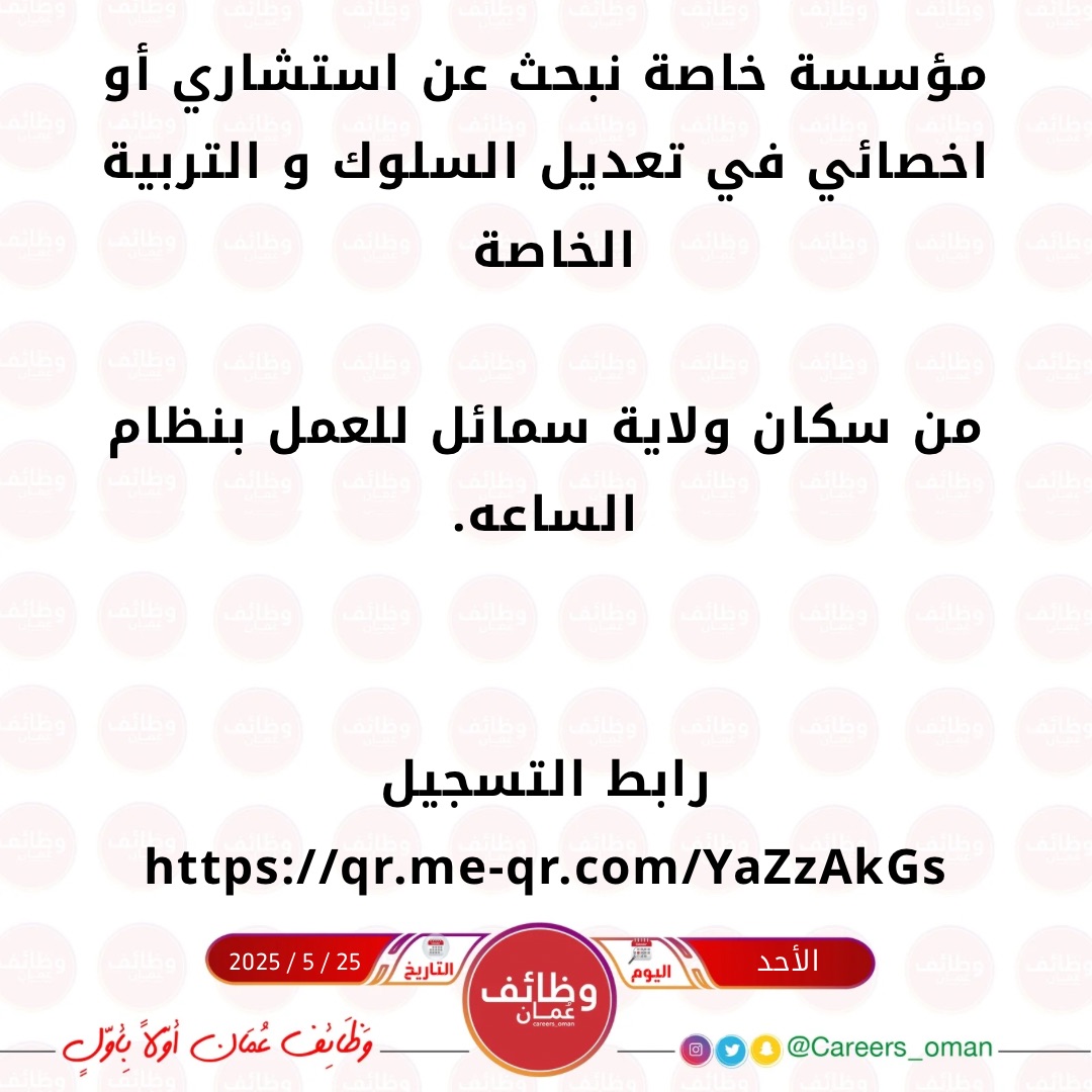 مؤسسة خاصة في سمائل - وظيفة شاغرة ( استشاري أو اخصائي في تعديل السلوك و التربية الخاصة )