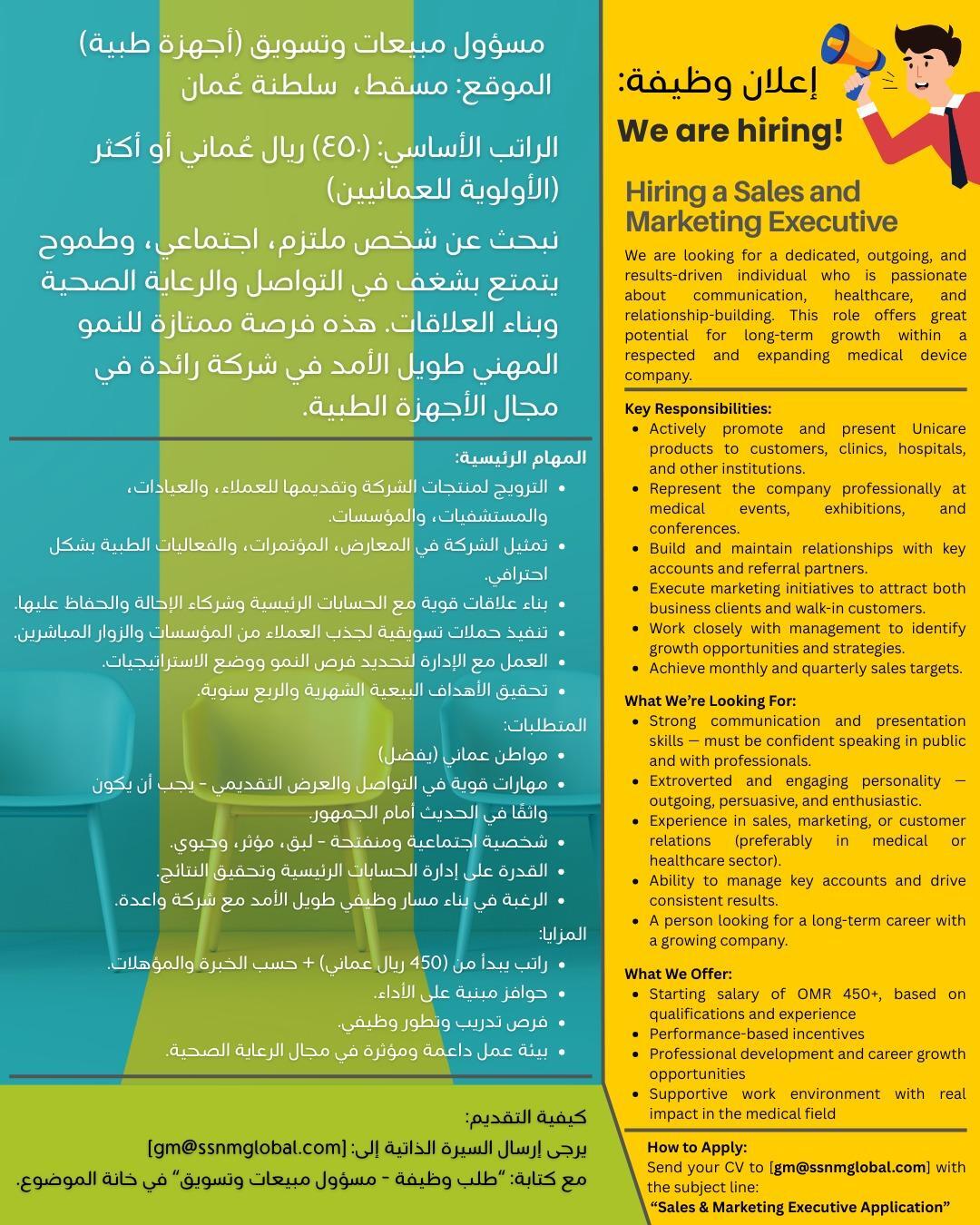 شركة رائدة في مسقط - وظيفة شاغرة ( مسؤول مبيعات وتسويق أجهزة طبية )