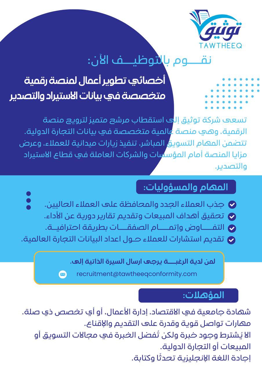 شركة توثيق في الغبرة - وظيفة شاغرة ( أخصائي تطوير أعمال المنصة )