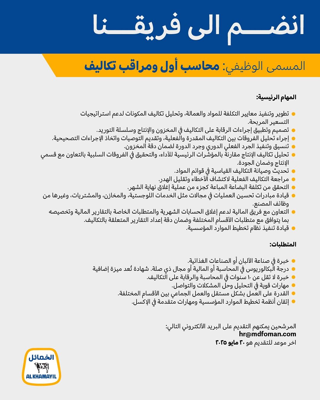 شركة الخمائل - وظيفة شاغرة ( محاسب أول ومراقب تكاليف )