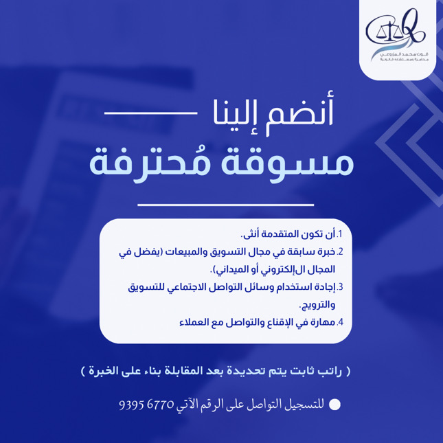 قوت المزوعية مُحامية ومستشارة قانونية - وظائف شاغرة ( مصور + مسوقة )