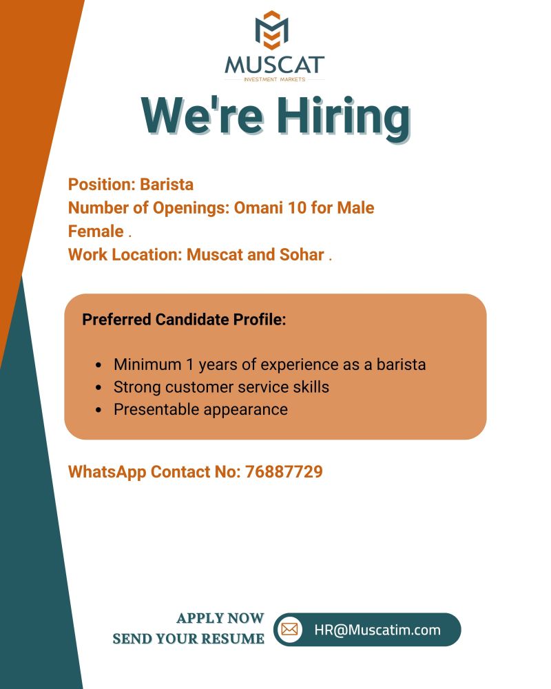 شركة أسواق مسقط للإستثمار فرع مسقط وصحار - 10 فرص وظيفية ( باريستا )