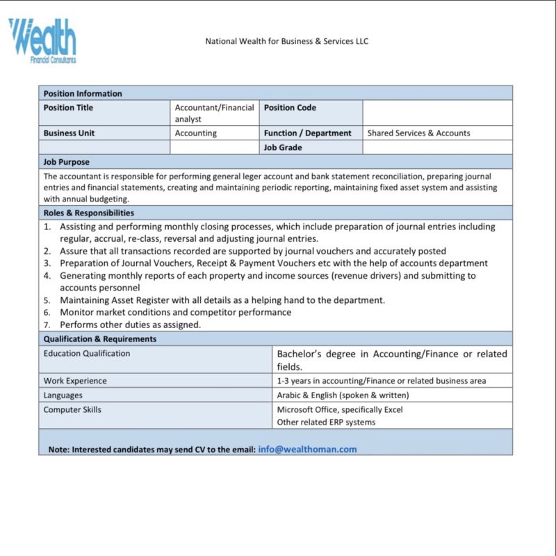 شركة الثراء الوطنية للأعمال والخدمات - وظيفة شاغرة ( Accountant/Financial analyst )