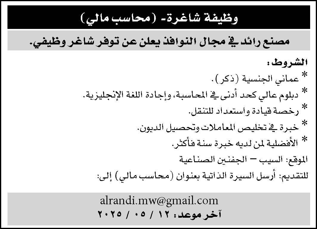 مصنع رائد في مجال النوافذ في السيب - وظيفة شاغرة ( محاسب مالي )