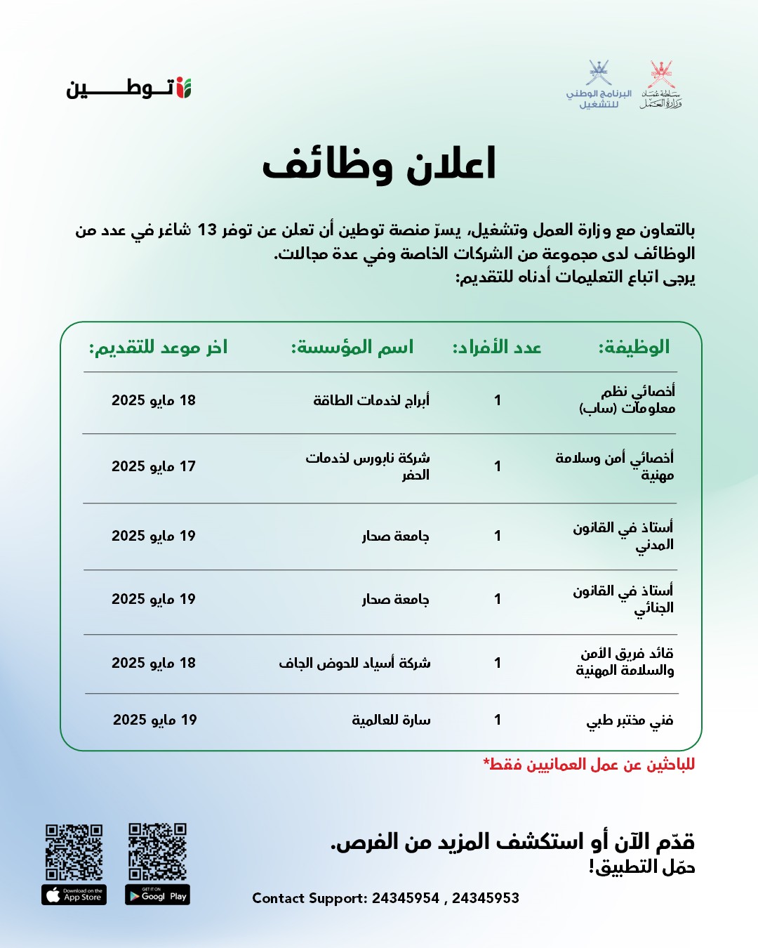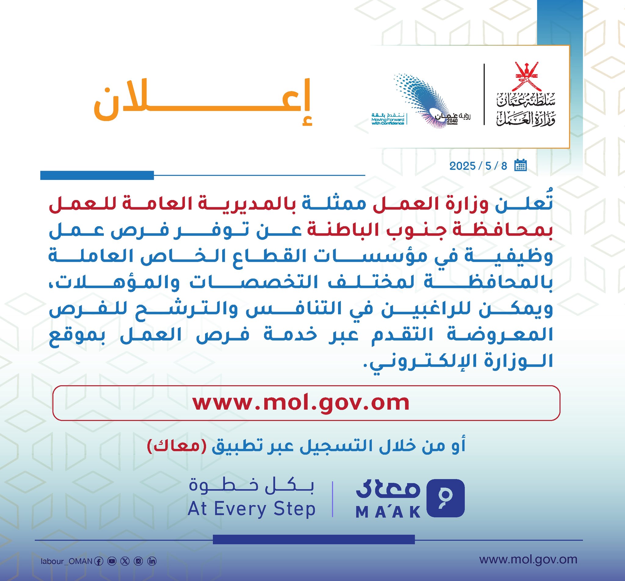وزارة العمل ممثلة بالمديرية العامة للعمل في محافظة جنوب الباطنة - توفر فرص عمل وظيفية في مؤسسات القطاع الخاص