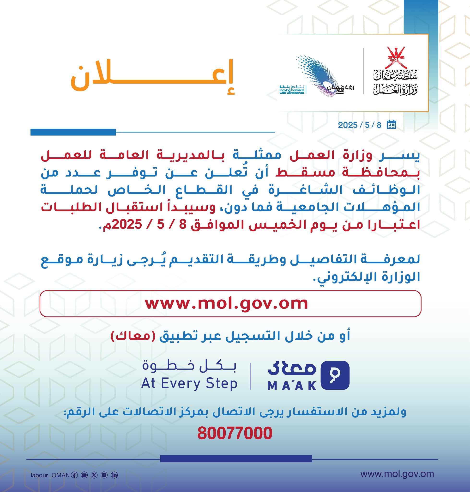 وزارة العمل ممثلة بالمديرية العامة للعمل بمحافظة مسقط - توفر فرص عمل وظيفية في مؤسسات القطاع الخاص