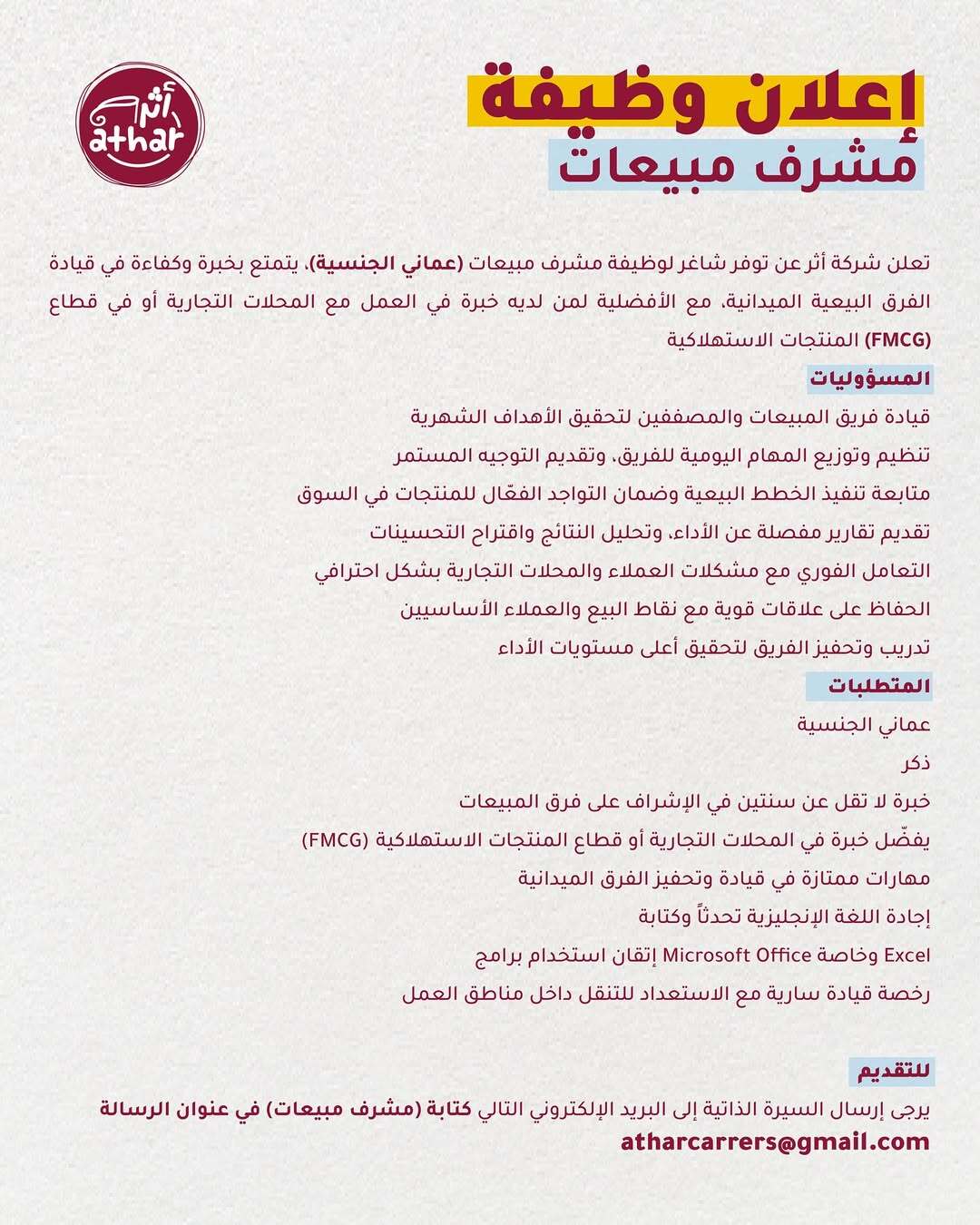 شركة أثير - وظيفة شاغرة ( مشرف مبيعات )