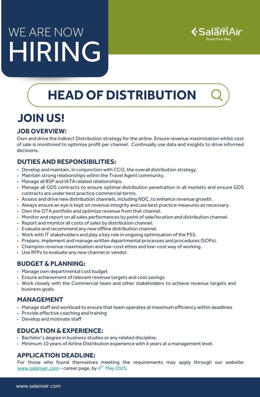 طيران السلام - وظيفة شاغرة ( Head of Distribution )