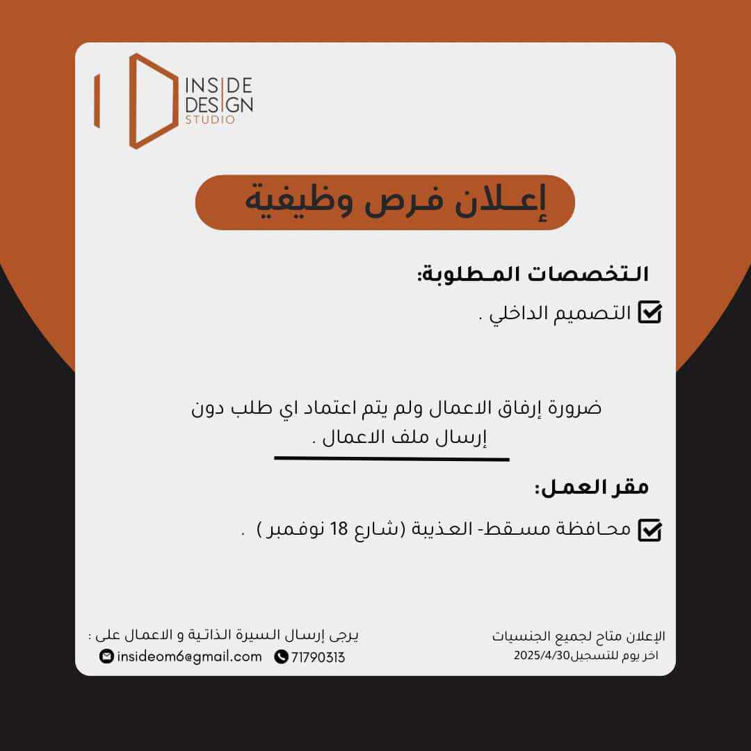 شركة انسايد ديزاين في العذيبة - وظيفة شاغرة ( التصميم الداخلي )