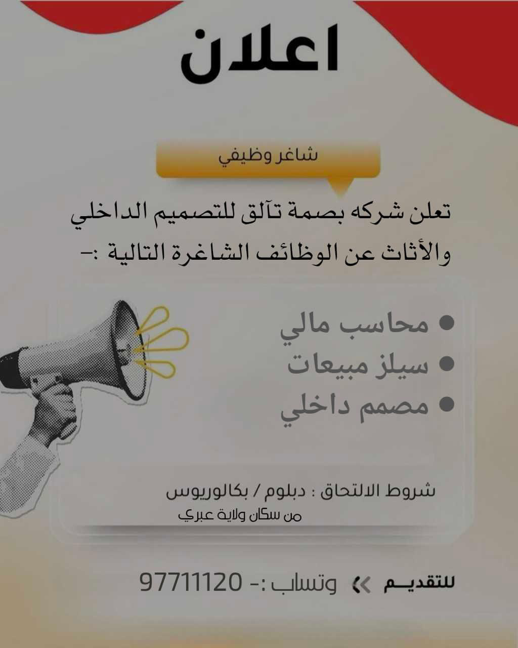 شركه بصمة تآلق للتصميم الداخلي والأثاث - وظائف شاغرة ( محاسب مالي + سيلز مبيعات + مصمم داخلي )