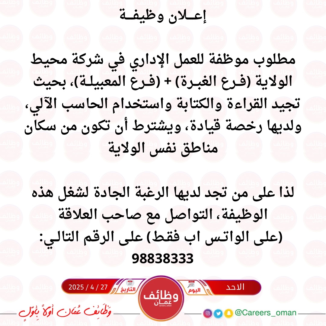 مكتب محيط الولاية فرع المعبيلة والغبرة - وظيفة شاغرة ( موظفة )
