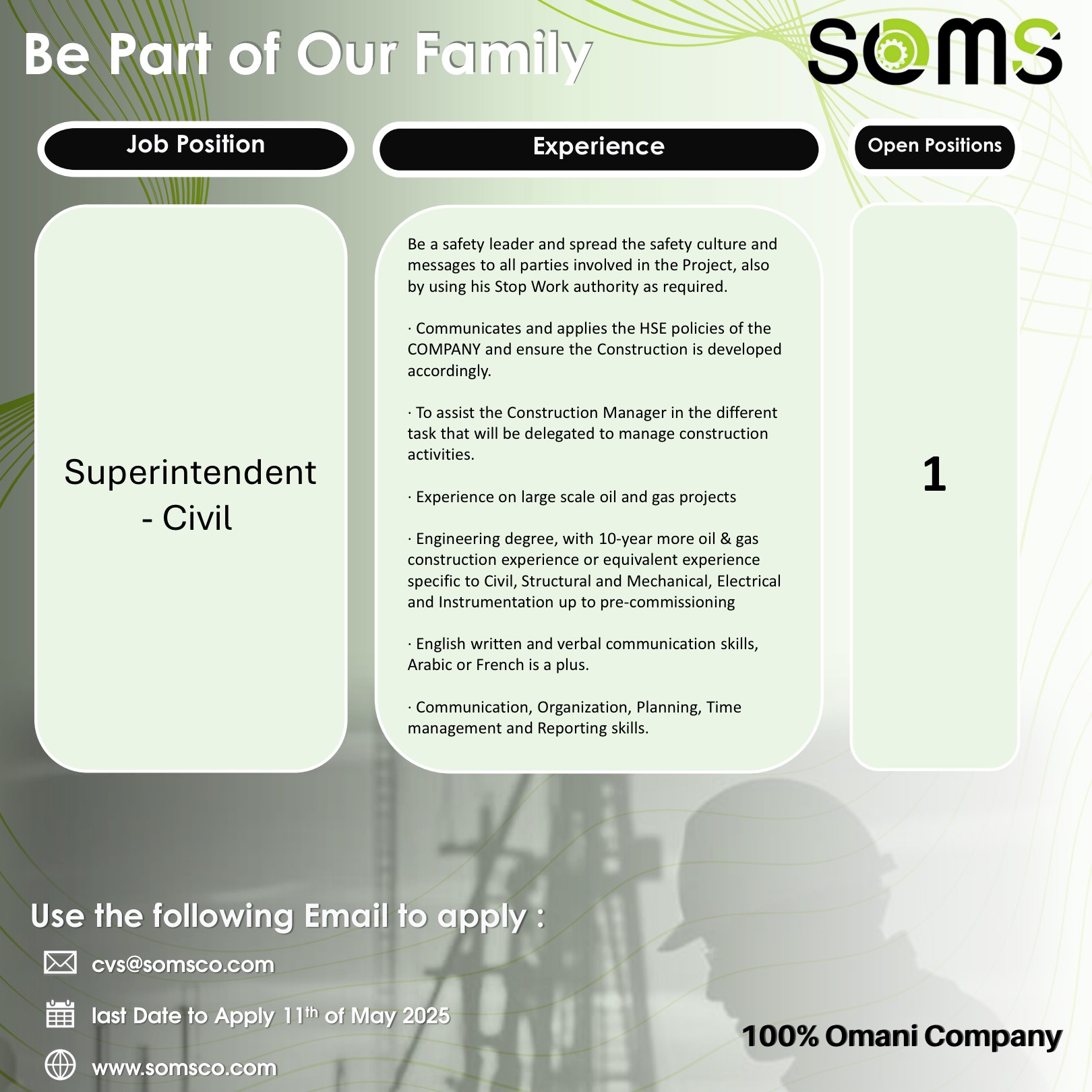 شركة التفوق للخدمات العصرية - وظيفة شاغرة ( Superintendent - Civil )